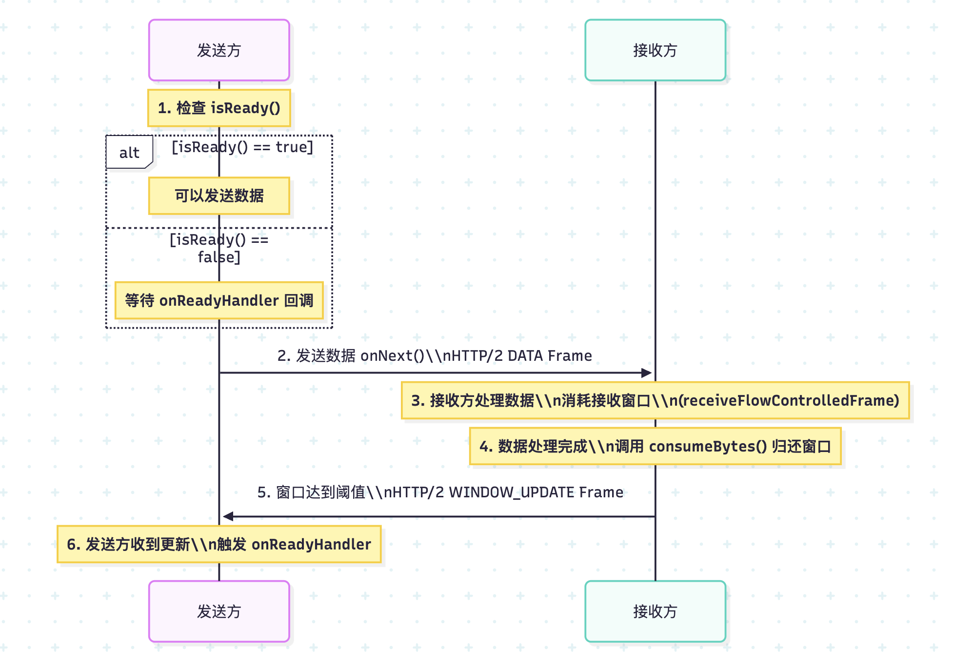 CallStreamObserver<T> | 背压控制的基础接口,提供 isReady()、setOnReadyHandler() 等方法 |